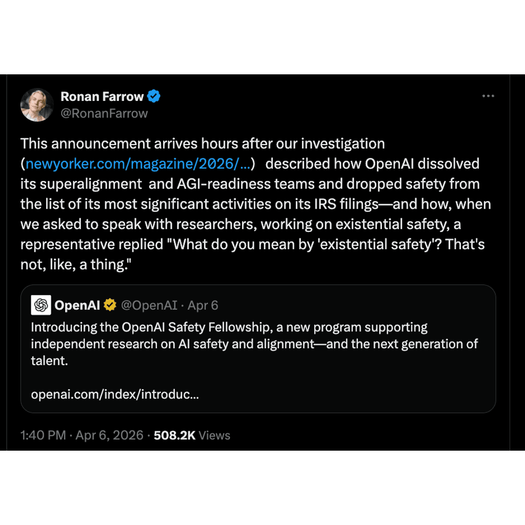 Six and a half hours after the New Yorker investigation went live, OpenAI announced a new "OpenAI Safety Fellowship" — $3,850 a week, less than five months long, light on specifics — to support outside research on AI safety. This is really just weeks after OpenAI’s representative responded to Farrow's interview request about existential AI safety with "What do you mean by 'existential safety'? That's not, like, a thing."